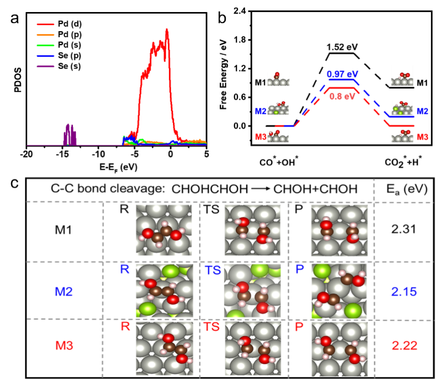 图5. a) Se掺杂Pd(111)表面的PDOS;b) 在EGOR过程中,在三种不同的模型表面(M)上,OH*助氧化CO*生成CO2的反应能垒;C) C-C键断裂的活化能和反应物(R)、过渡态(TS)和产物(P)的结构模型。M1为纯Pd(111)面,M2为Se掺杂Pd(111)面,M3为拉伸应变为3.5%的Pd(111)面。