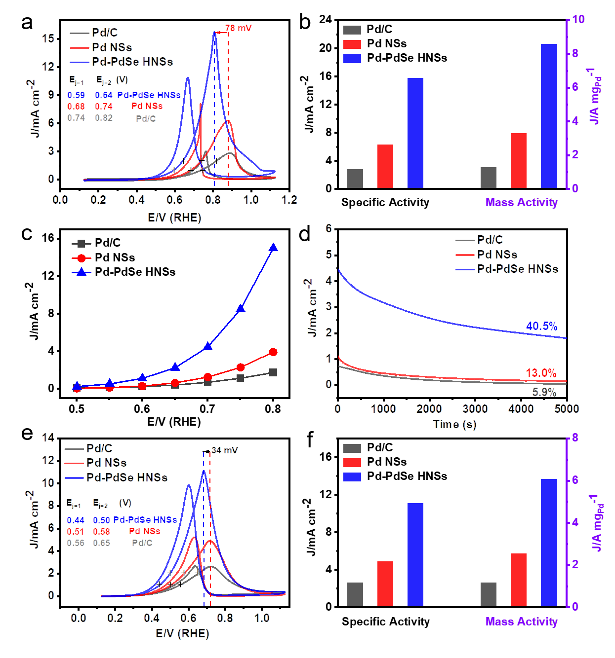 该工作在碱性介质中考察了Pd-PdSe HNSs对乙二醇的催化性能。同时选择Pd NSs和工业Pd/C作为参比催化剂。通过比较不同催化剂在N2饱和碱性溶液中的EGOR循环伏安曲线。Pd-PdSe HNSs的比活性(质量活性)为15.7 mA cm-2(8.6 A mg-1),表现出最高的催化活性,是Pd NSs和商业Pd/C的2.5(2.6)和5.5 (6.6)倍(图3b)。此外,Pd-PdSe HNSs具有显著的还原潜力。在电流密度为1 mA·cm-2(2 mA·cm-2)时,Pd-PdSe HNSs的电位比Pd NSs和商品Pd/C分别降低了90(100)mV和150(180)mV。特别是Pd-PdSe HNSs的最大电流密度电位比Pd NSs降低了78 mV。图3d采用计时电流法(I-t)对催化剂的稳定性进行了评价。Pd-PdSe HNSs的电流在5000s耐久性测量后仍可保持40.5%,远高于Pd NSs(13.0%)和商用Pd/C(5.9%)。稳定性显著提高结果表明,与Pd NSs和商用Pd/C相比,Pd-PdSe HNSs具有较低的反应能垒。除了EGOR,Pd-PdSe HNSs同样表现出了优越的EOR性能,Pd-PdSe HNSs的比活性(质量活性)分别是商用Pd/C和Pd NSs的4.2 (5.1)和3.2 (2.0)倍(图3e,f)。