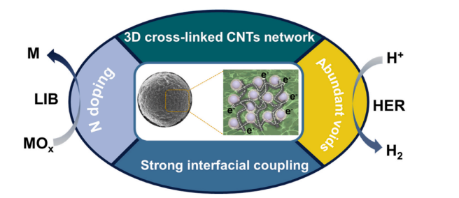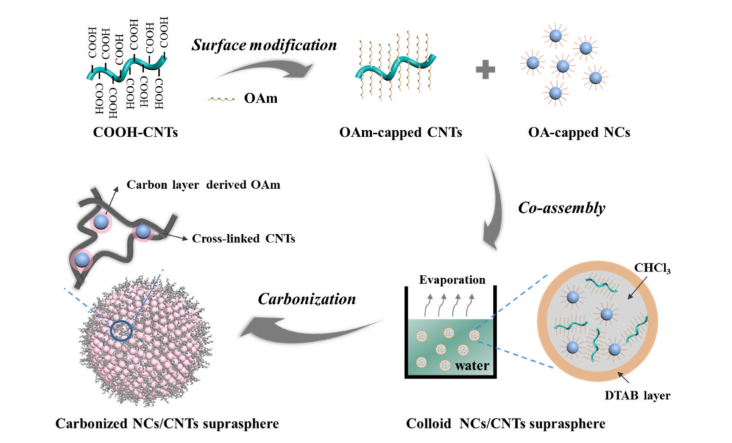 韩丹丹老师课题组一直致力于纳米晶材料合成、自组装结构设计及光电应用研究。在最新的工作中,团队实现了长链烃配体对COOH碳纳米管的表面修饰为基础,为限域蒸发诱导的共组装工艺的各种NCs/CNT超球提供了通用的合成平台。这种方法成功地将碳纳米管引入胶体组装领域,可以有效地改善碳纳米管组装体的物理和化学性能。与基于物理混合的传统策略不同,在共组装过程中长链烃配体的缠结赋予了NCs/CNT超球体在两个构建块之间的强界面耦合。之后超级微球分别在锂离子电池和HER中测试了其电化学性能,得益于3D交联CNT网络,共组装的NCs/CNT超球体及其衍生的磷化物显示出优异的导电性和丰富的空隙以及高稳定性,从而确保其优异的电化学性能。这种基于碳纳米管表面改性的跨维共组装策略为目标异质超结构的精确工程开辟了一条强有力的途径。
