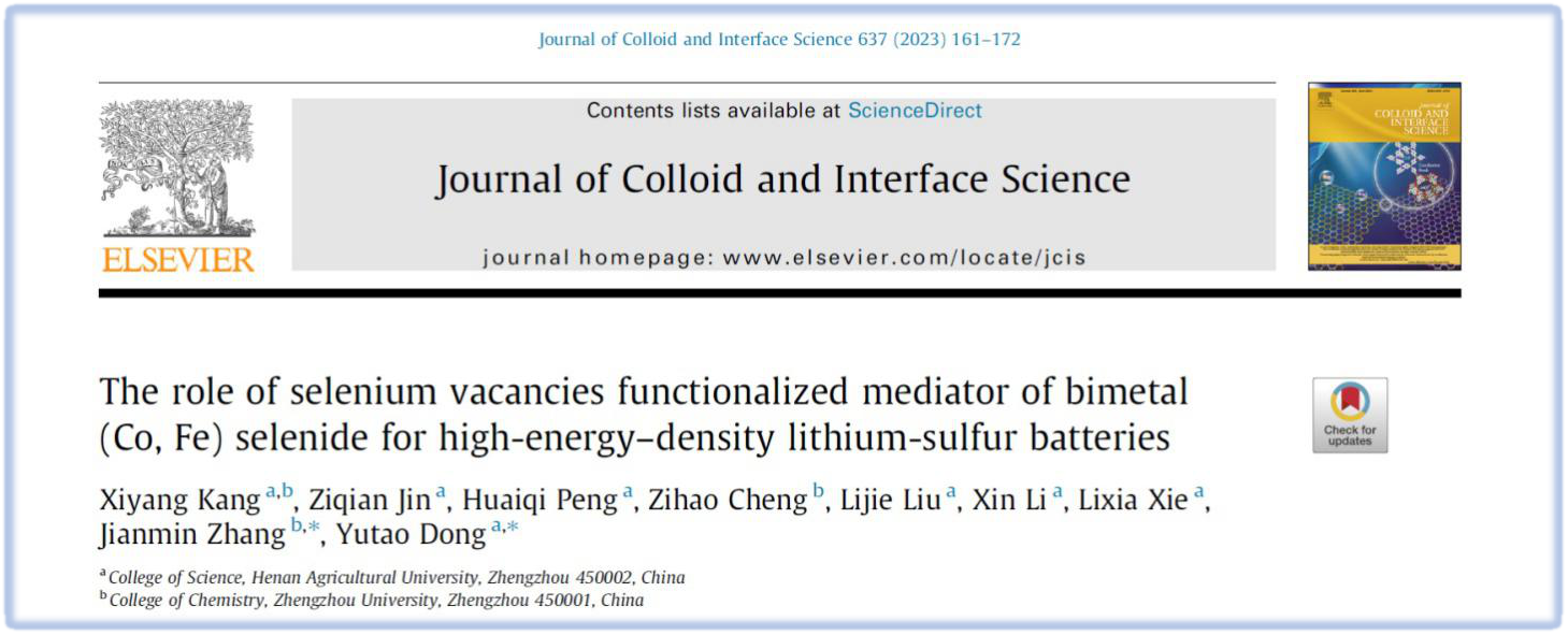 该研究成果以“The role of selenium vacancies functionalized mediator of bimetal (Co, Fe) selenide for high-energy-density lithium-sulfur batteries”的论文形式在线发表在期刊Journal of Colloid and Interface Science上。该研究由董玉涛教授团队和郑州大学张建民教授团队合作完成,国产无码