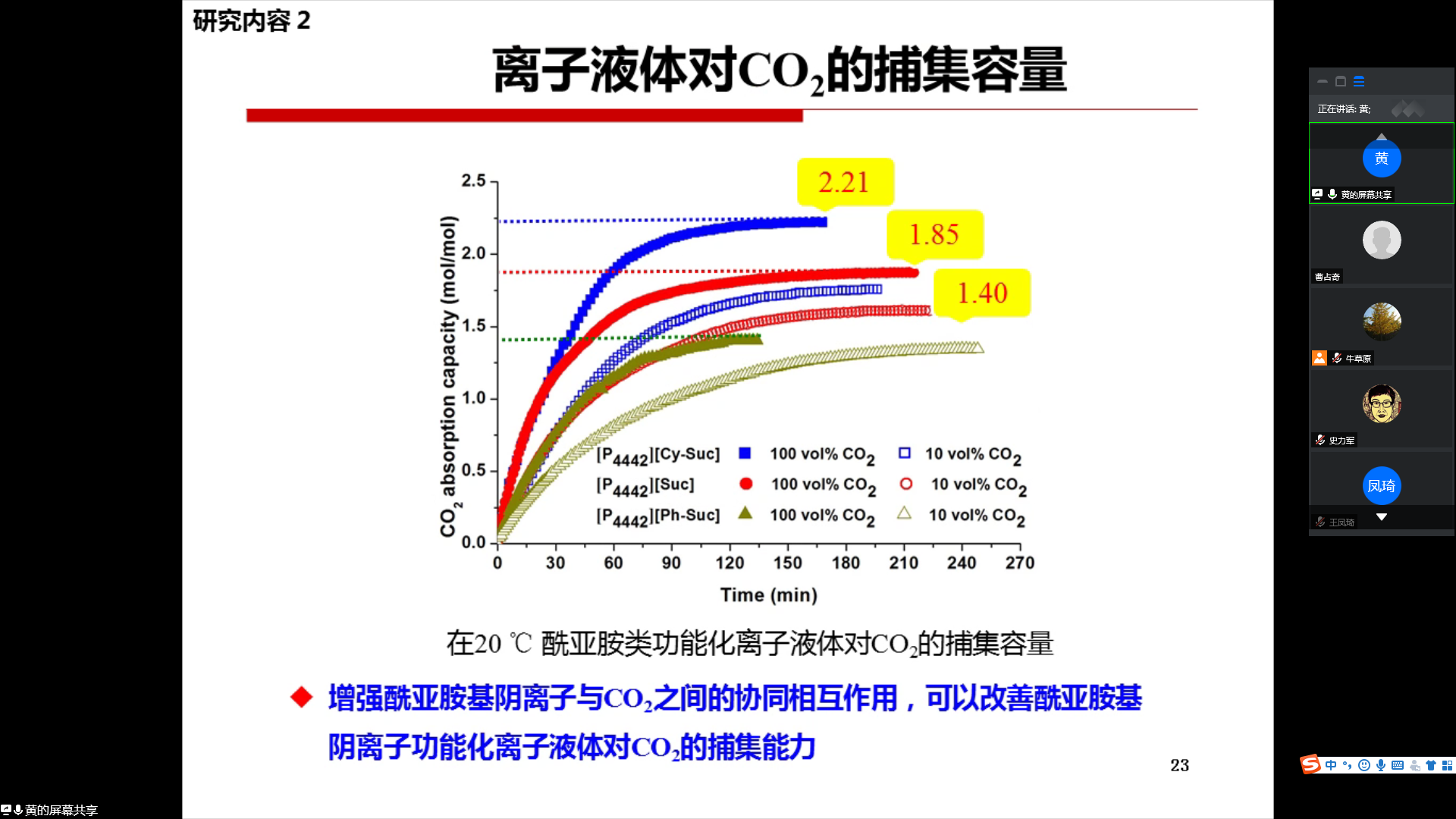 2向大家介绍了自己博士期间的工作:① 以离子液体结构的可调变性,设计合成了一系列酰亚胺类阴离子功能化离子液体应用于低浓度CO