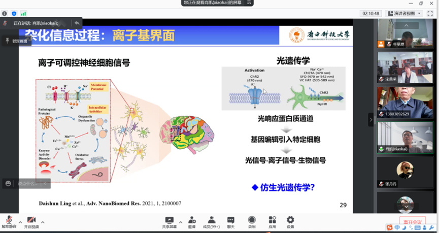 南方科技大学肖凯教授以《生物与仿生纳米离子学—基于离子传输的能源体系与信息过程》为主题进行了报告分享。肖凯表示向生物智能生命学习是人类科学和技术发展永恒的主题,如何构筑基于离子传输的能源与传感体系,从而架起智能生命和仿生体系的桥梁,是我们未来面向人工智能的一个重要挑战。该研究体系以限城空间内的可控离子传输为基础,涉及固液界面,生物/无机界面,强相互作用等基础物理化学问题,同时具有和纳米流体,膜科学,电化学,生物电子学,人工智能等领城高度交叉的特点。围绕限域空间内的可控离子传输及其应用这一目标,肖凯及其课题组在新型固态纳米流体器件的构筑及其离子输运性质的研究,离子传输在能源转换中的应用,离子传感体系的构筑及研究等领域取得一系列具有原创性的研究成果。