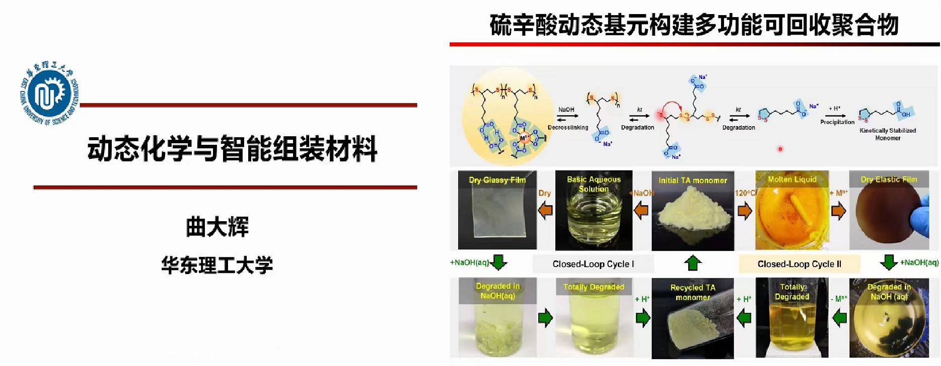 曲大辉教授作了题为《动态化学与智能组装材料》的报告。报告主要围绕通过功能分子基元的动态共价键和非共价键的多级组装,创制具有刺激响应、可逆性、自修复的自适应性智能材料开展。基于超分子化学的动态性,曲教授团队致力于利用主客体结构、机械键化学、分子开关等动态分子基元在有机无机表界面进行自组装和功能化,利用分子基元动态性赋予整个组装体动态性,实现对微观、宏观人工分子系统功能的精准调控,并利用这些人工合成体系在一定程度上对生命体中类似动态功能的生物动态系统提供借鉴和指导意义。他介绍了一系列硫辛酸和机械互锁动态分子基元,创新了动态分子基元的多级、协同组装策略,实现了智能组装材料的动态性能调控。