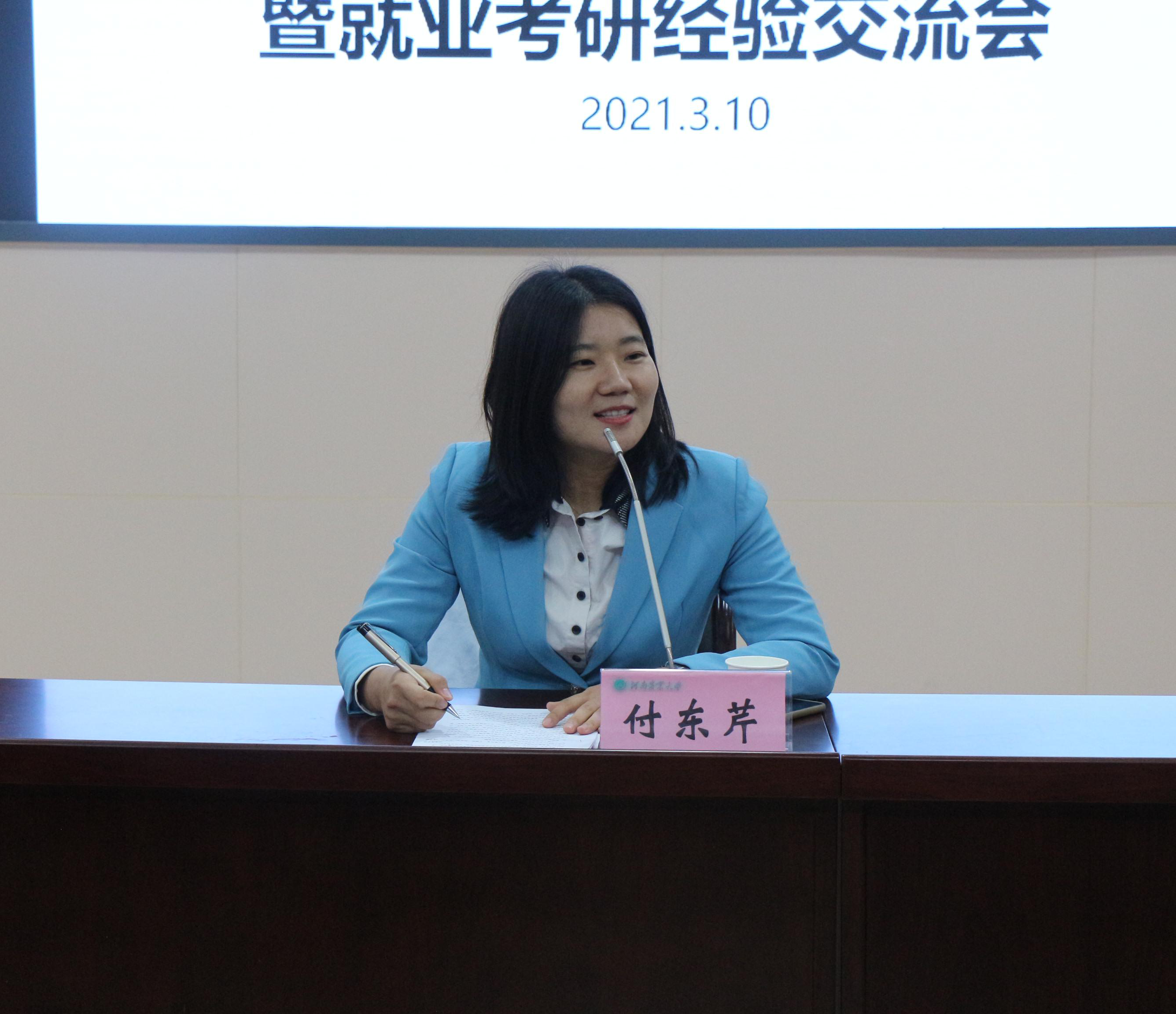 会上,优秀校友付东芹结合自己的就业经历强调在就业择业的过程中要树立远大的生涯目标,相信自己并为之努力奋斗;要放低姿态,不要拘泥于专业与城市,找到适合自己的工作岗位。在工作过程中要努力扩充自己的能力,提高自己的价值;要把握机会,紧跟时代潮流,利用好大平台。最后,她提醒学弟学妹要保护好自己,提高警惕,远离电信诈骗、传销、贷款。