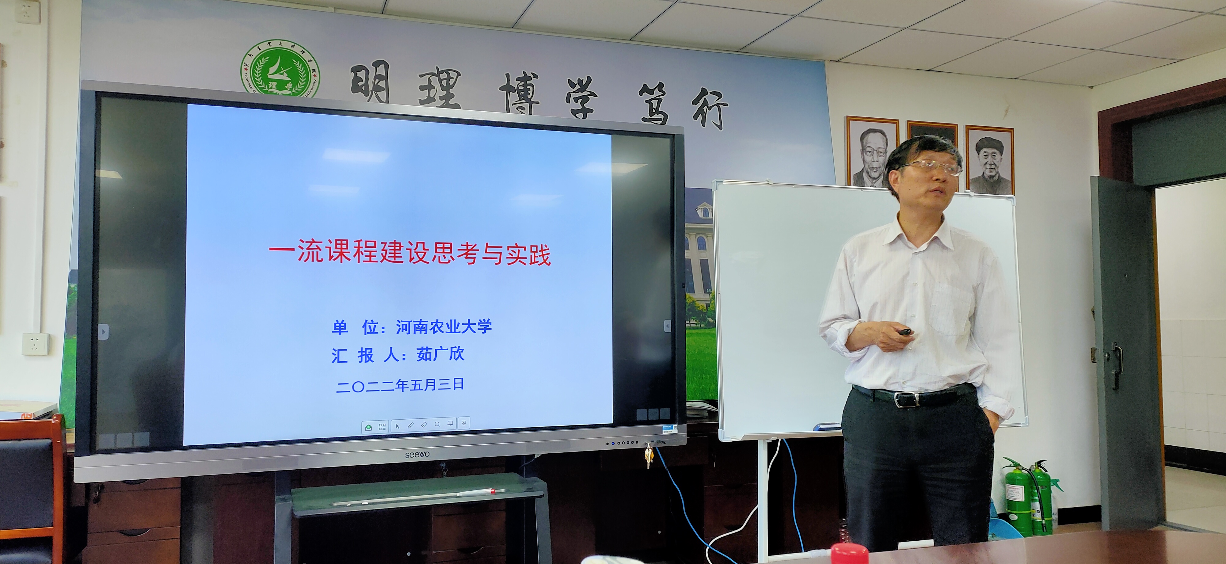 于5月3日在文化路校区20号楼415教室举办了“立德树人提升教学能力、课程思政引领教学创新”一流课程建设推进会暨课堂教学创新大赛。学院邀请教务处副处长茹广欣教授、校教学督导组肖传斌教授、全国教学技能大赛一等奖获得者雷萌萌老师担任评委出席会议。