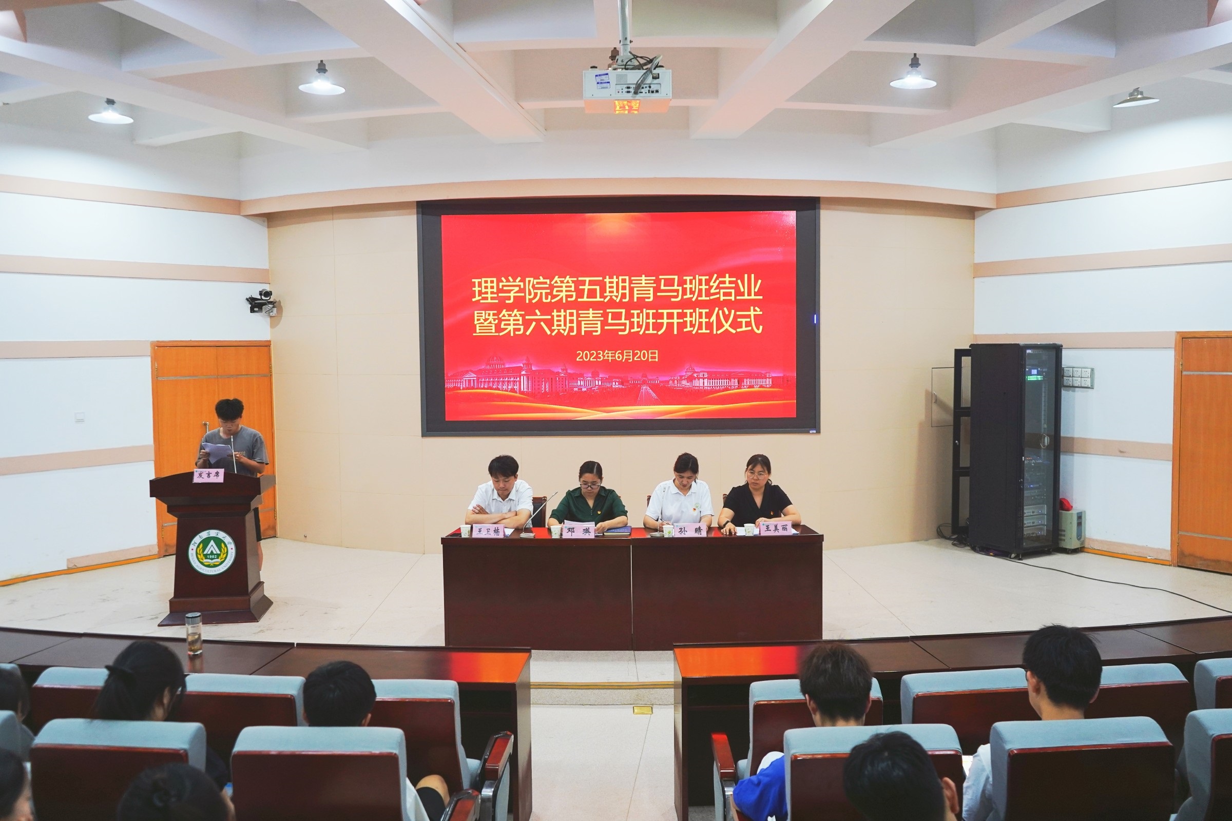 于文化路校区300人报告厅举办第五届青马班结业暨第六届青马班开班仪式。团委书记邓瑛、正科级组织员孙晴,团委老师王美丽、王卫楠出席会议,青马班全体成员参与会议。