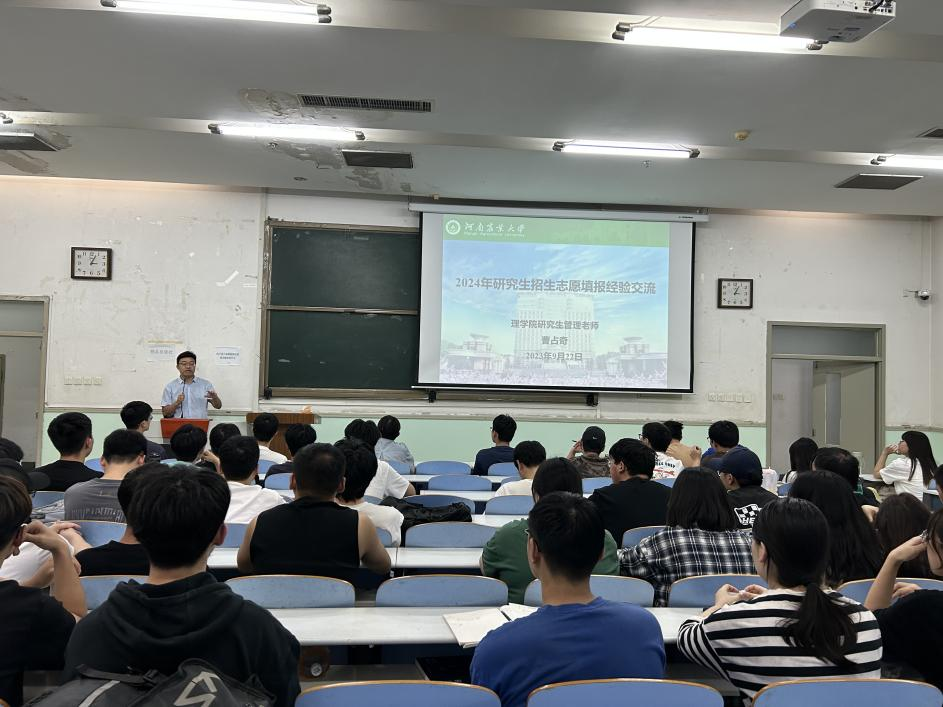 会上,曹占奇基于大数据介绍了近五年的研究生报考情况、考研分数情况及报考注意事项,详细介绍了研招网填报学校的主要流程和注意事项,并在自由交流环节详细解答了同学们关心的问题。