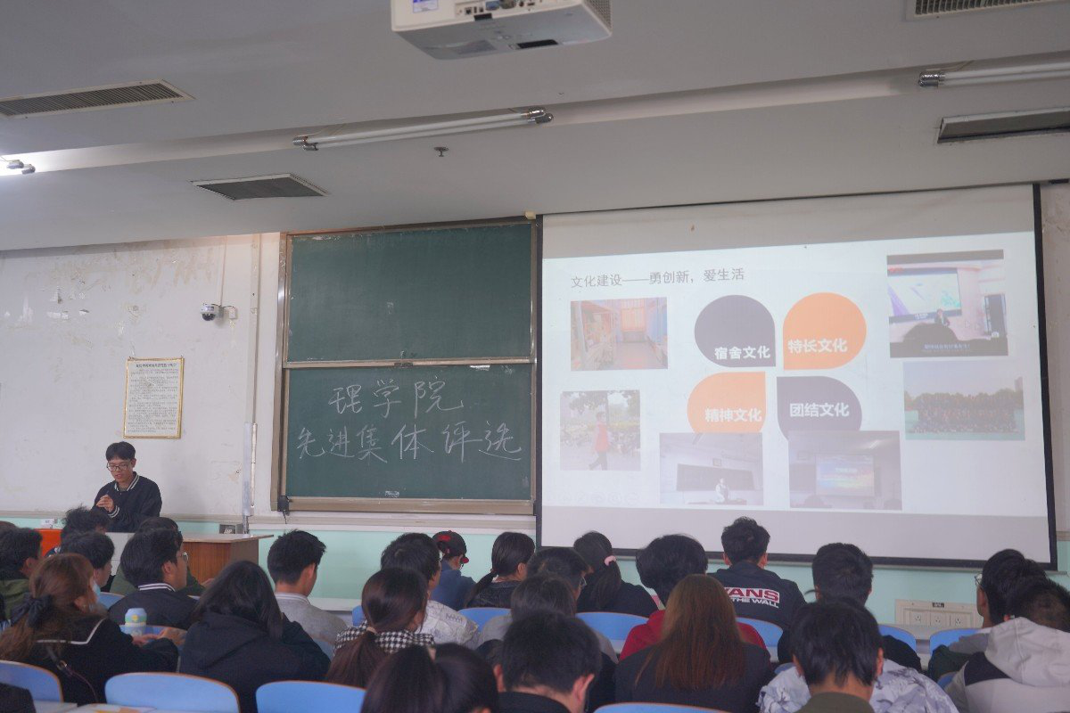 会上,各班级依次从组织建设、青年大学习学习情况、主题团日活动、学风建设、风采展示等方面进行汇报,彰显出班级强大的凝聚力、团结向上的班风、创新进取的精神风貌。邓瑛作总结讲话,她充分肯定了各班级奋发向上的精神风貌,希望各班级在今后的工作中再接再厉,建设思想先进、团结协作、朝气蓬勃的班集体。
